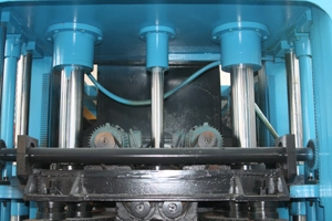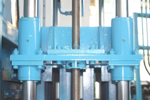 There are tree cylinders on the upper mold . The middle one assures the lifting speeding and the other two on both sides ensures the pressure of the upper mould.